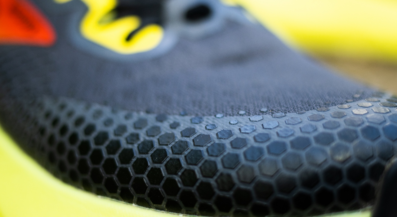 Mesh’et virker solidt, og er beskyttet af et ekstra lag tyndt gummimateriale – særligt rundt ved tæerne. På oversiden er mesh’et mere luftigt, om end denne del også ser ud til at udmærke sig særligt på holdbarhed og styrke.