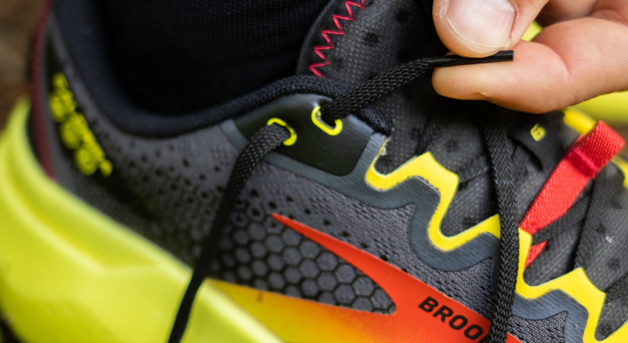 Som en sjov detalje har de på Brooks Caldera 6 lavet en ”snørebåndsholder”; en elastik, som du kan lægge snørebåndene ind under, så de ikke flagrer rundt. Jeg har dog ikke oplevet problemet med for lange snørebånd i denne sko, men det er alligevel en lækker detalje – så er der mindre risiko for, at snøren sidder fast i terrænet.